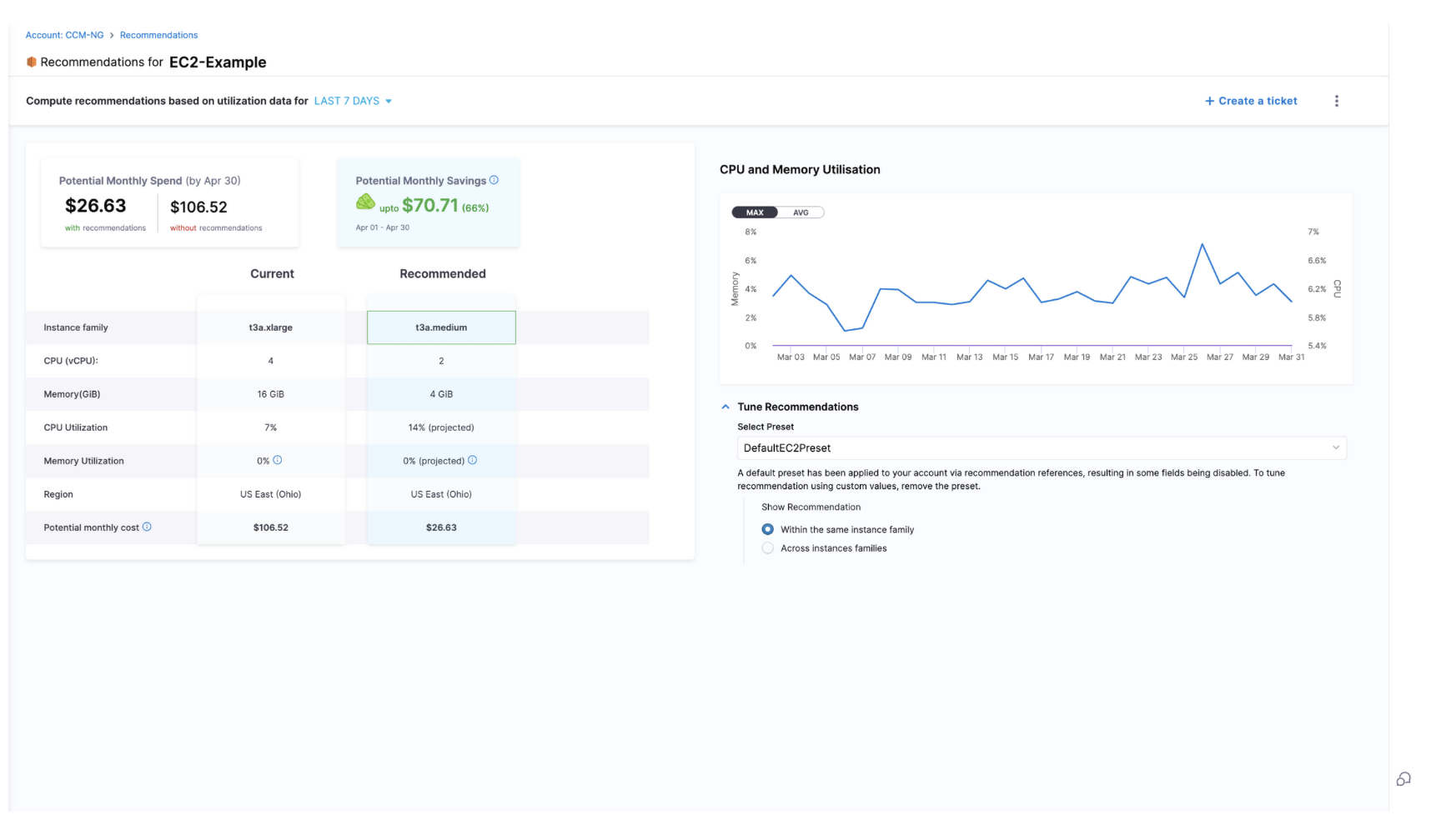 The recommendations are computed by analyzing the past utilization of the CPU and memory of your EC2 instance. Harness CCM leverages the AWS EC2 recommendations. CCM uses the AWS APIs and fetches the data from the AWS account.