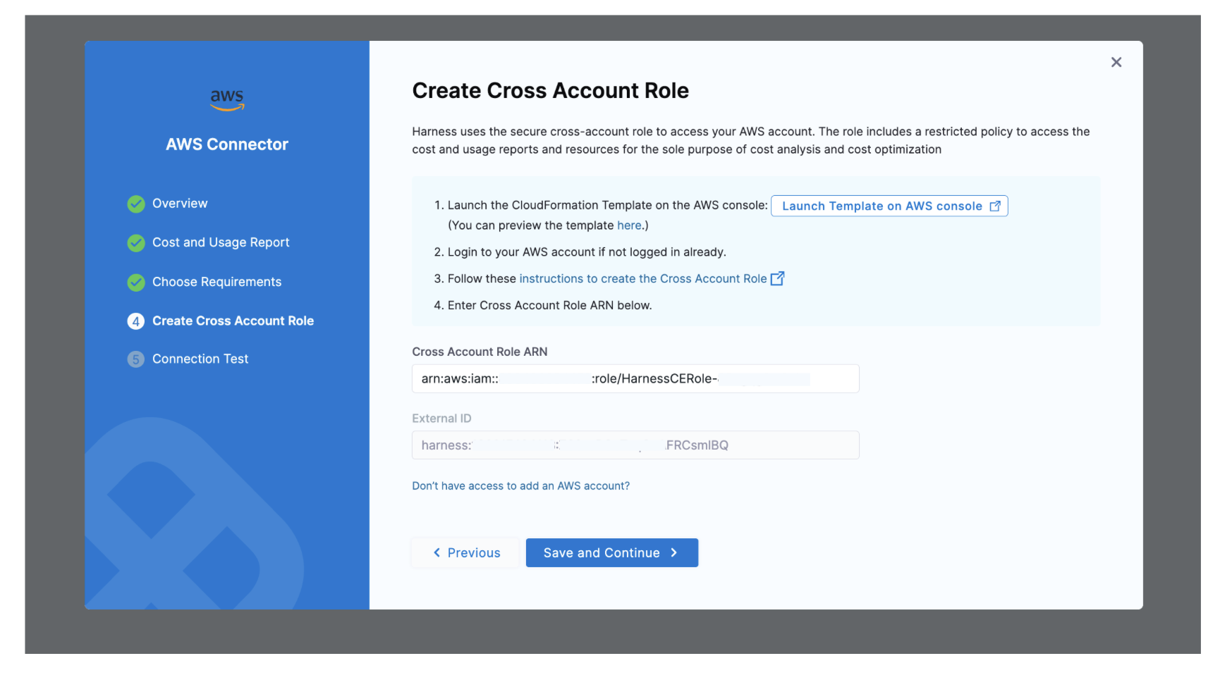 - Connect your AWS cloud account in Harness and set up CCM for cost management. For more information, go to Set up cost visibility for AWS.