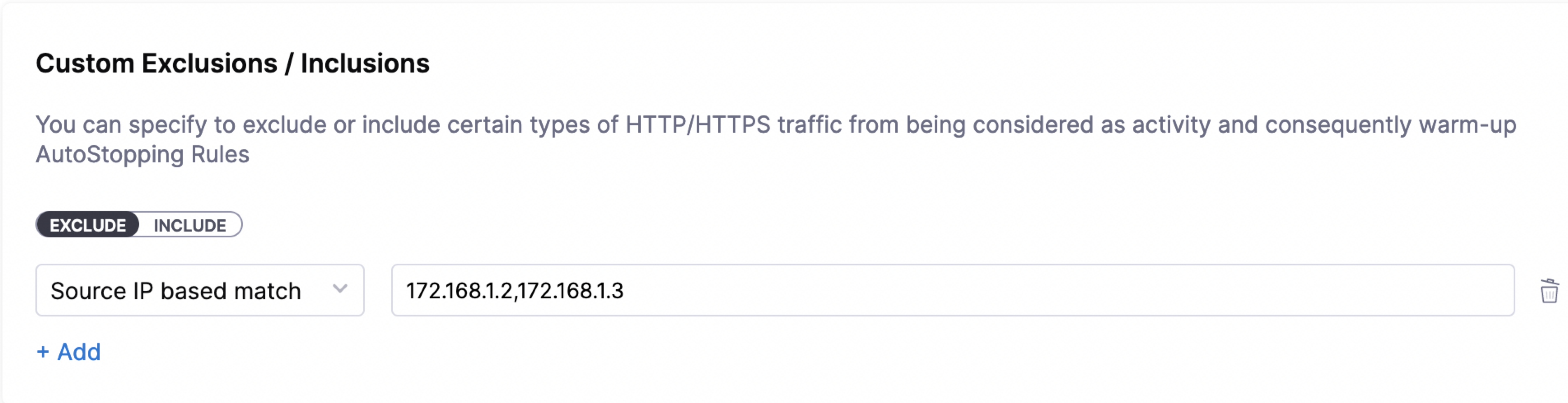 Similarly, you can configure custom inclusions. Requests to the specified path or from the specified IP address alone can invoke the cloud resource managed by AutoStopping. Only these requests are detected as traffic by the AutoStopping rule.
