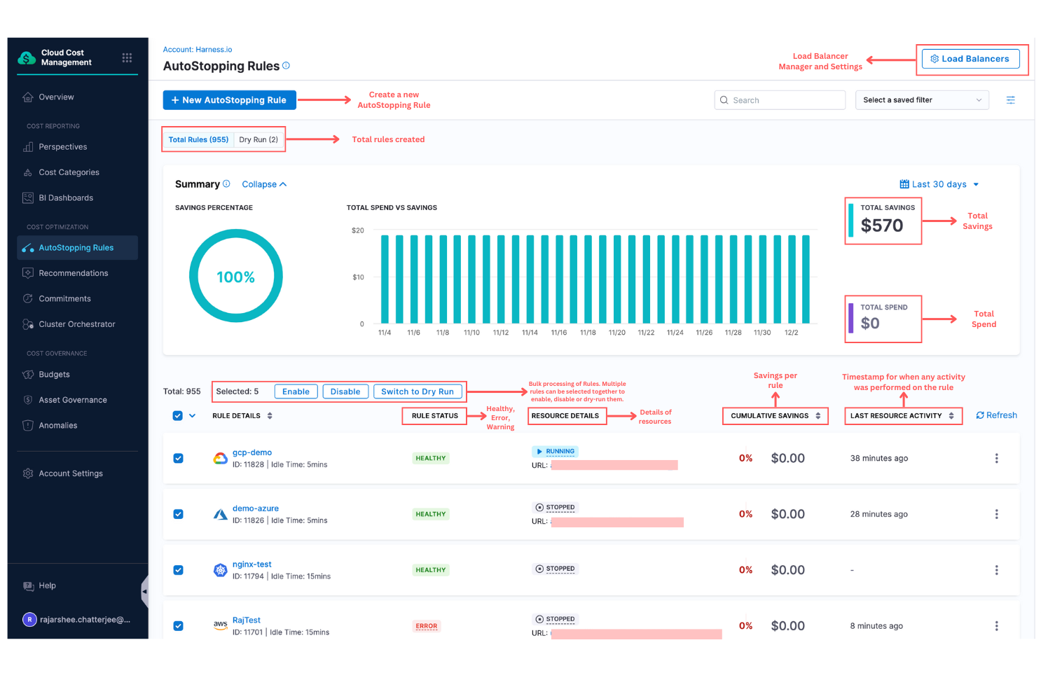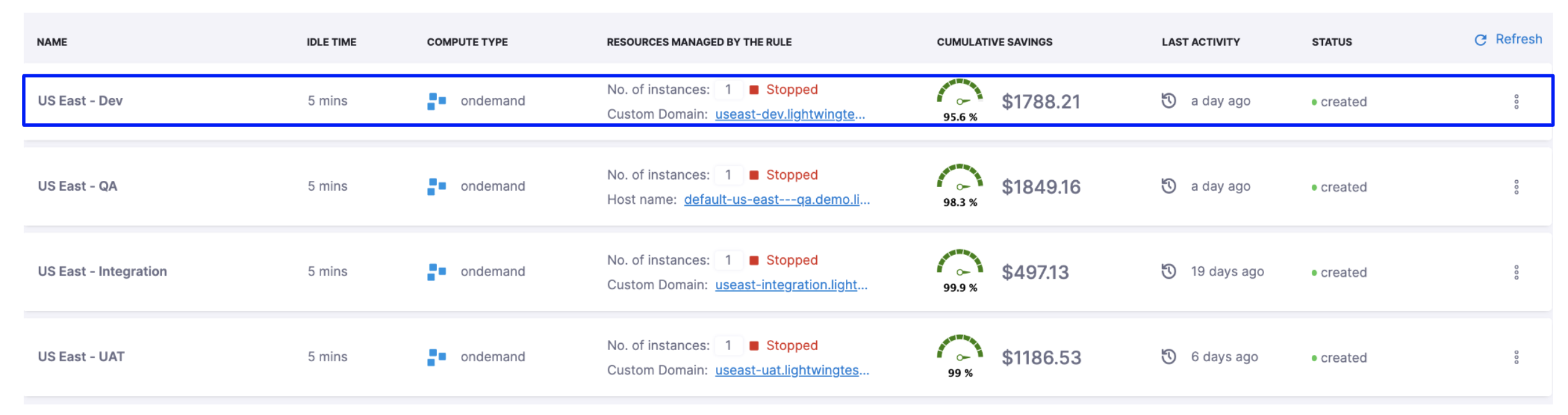 AutoStopping dashboard allows you to view a summary of all the AutoStopping rules you have created in a simple and intuitive interface. The following are the key features of the AutoStopping Rules dashboard: