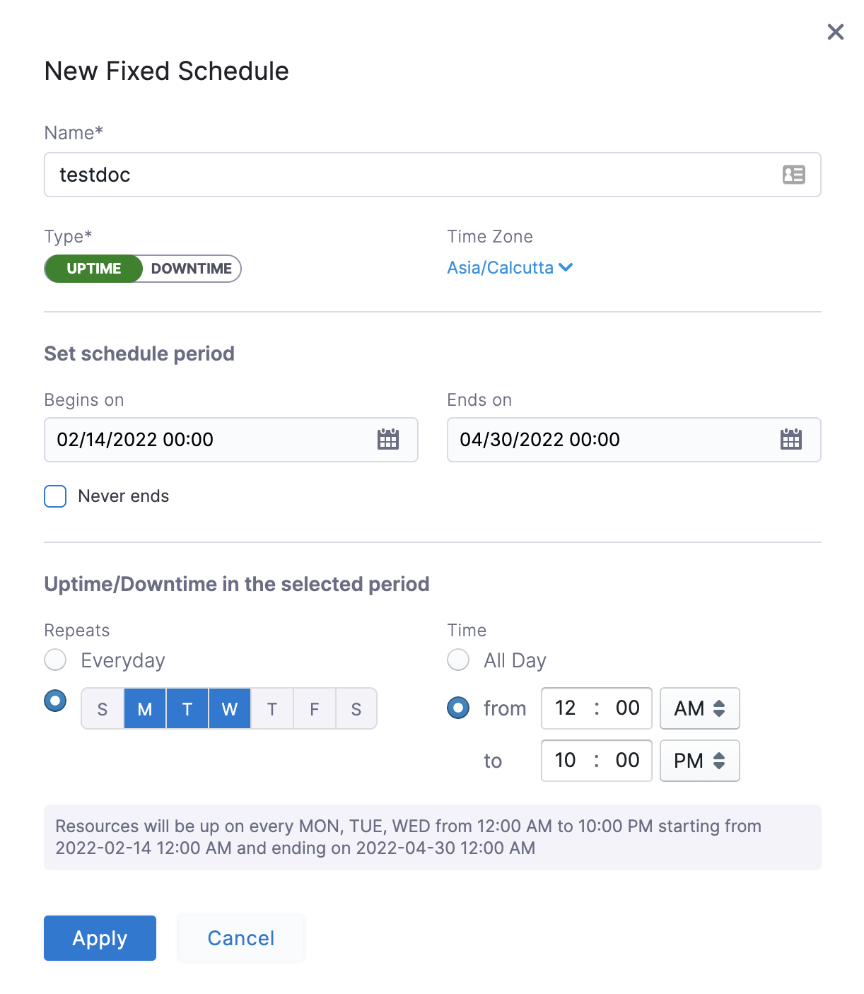 In the following example, resources will be up every Mon, Tue, Wed starting from 12:00 a.m. on February 14, 2022 till April 30, at 10:00 p.m.