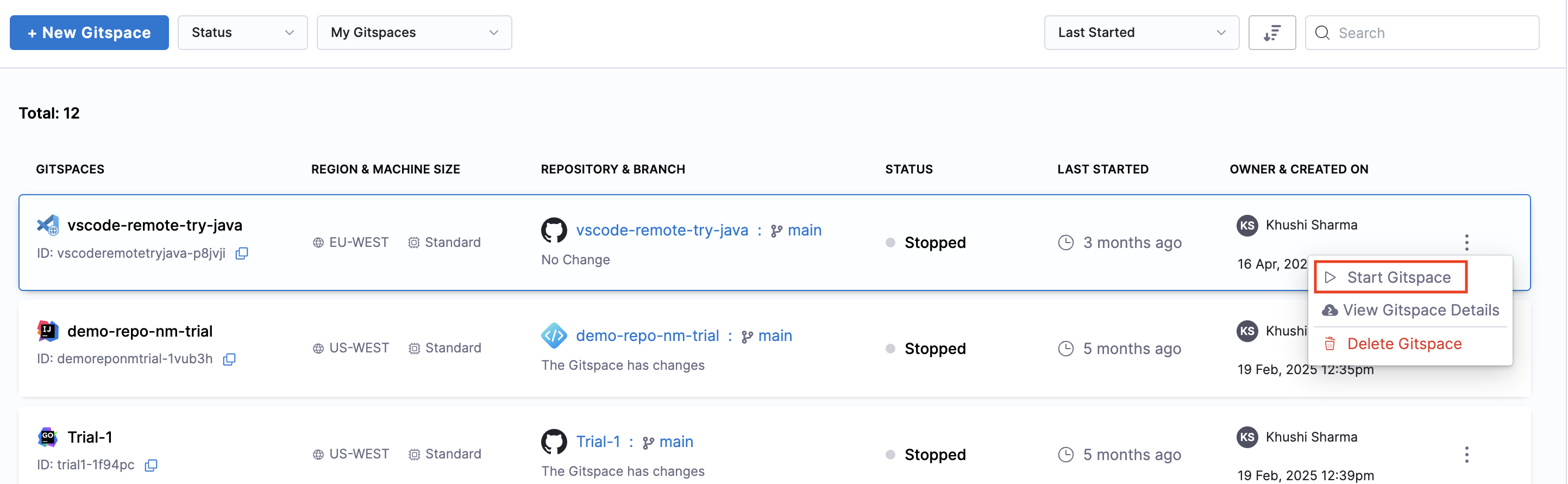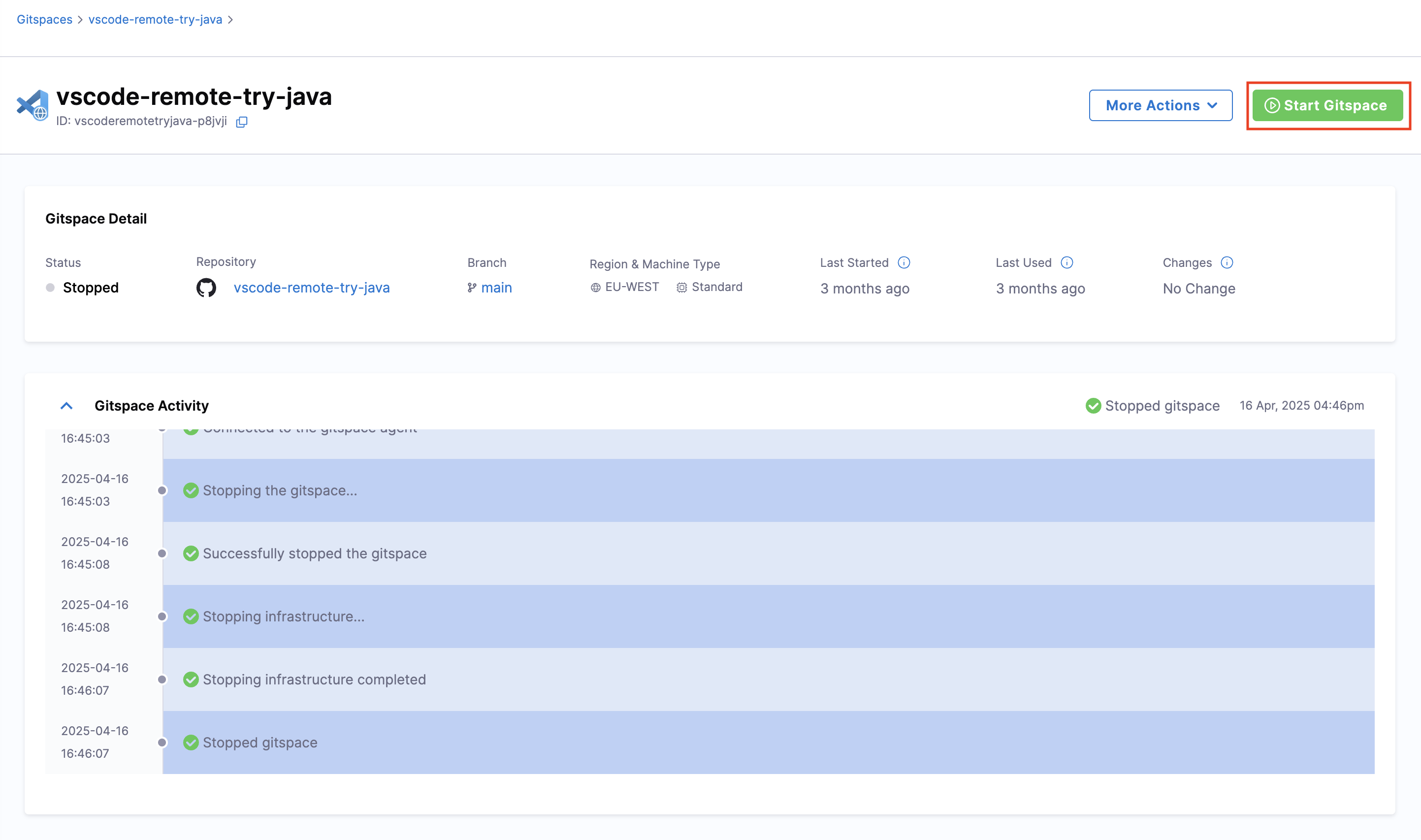 - On the Gitspace Details UI, Start Gitspace is available in the More Options menu.