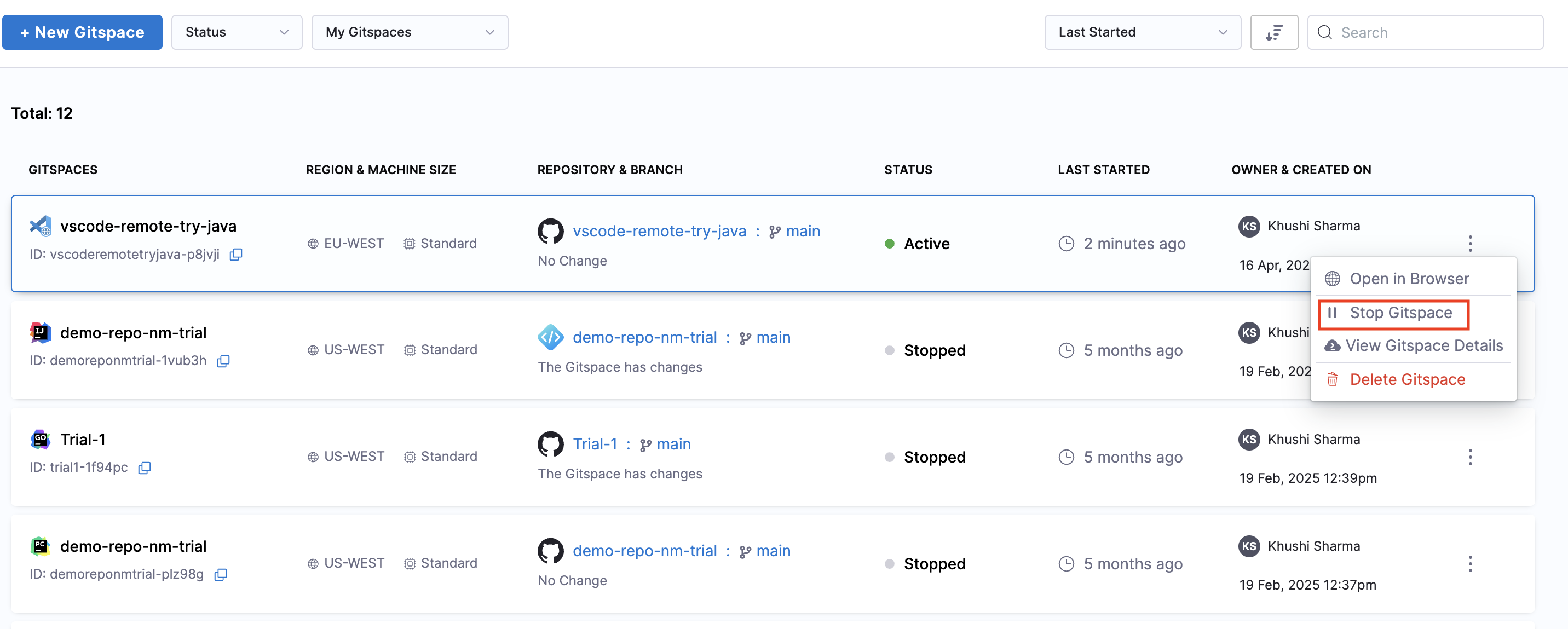 Start/Stop Gitspaces