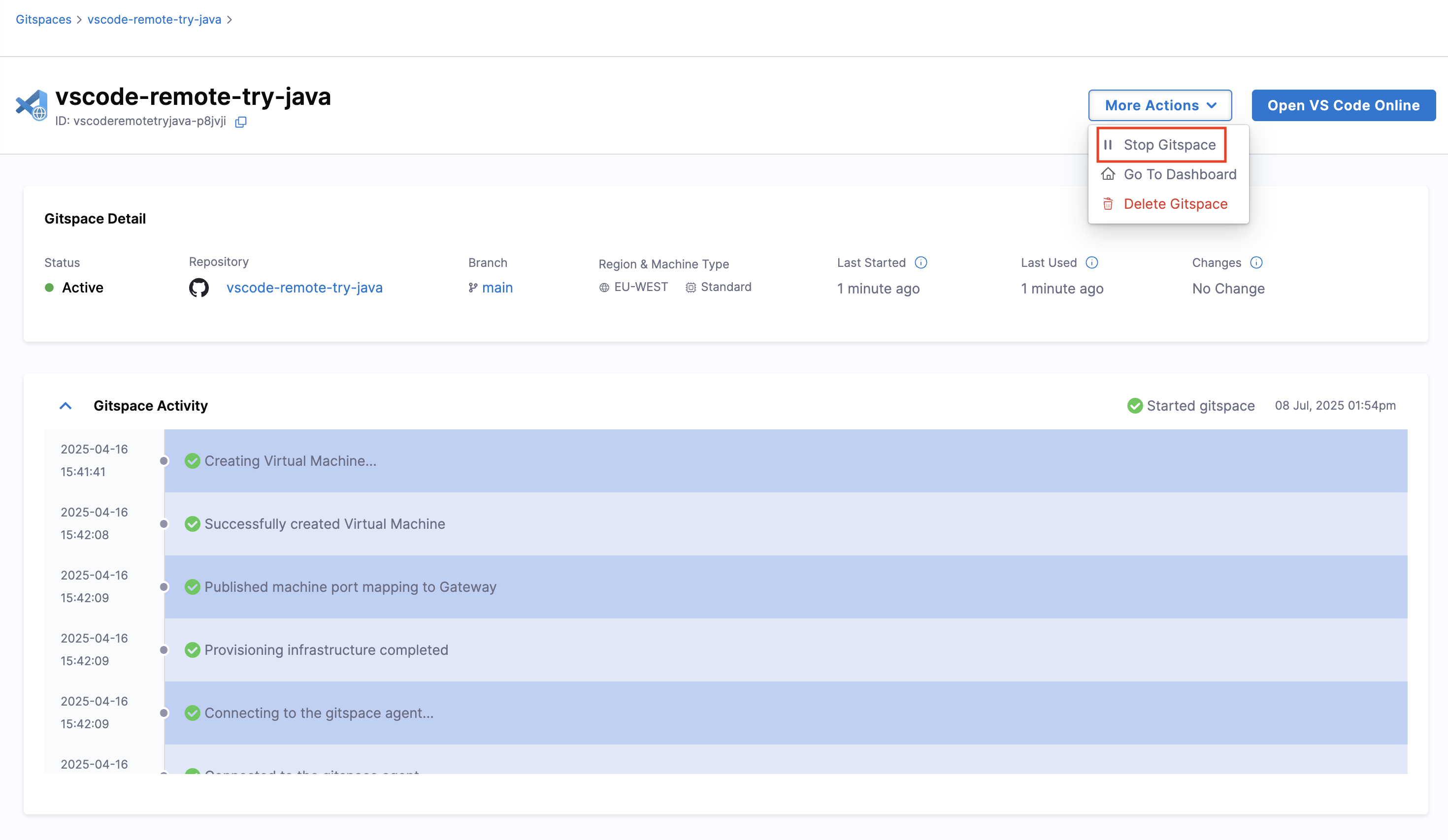 - On the Gitspace Details UI under More Actions, there's an option to Stop Gitspace.
