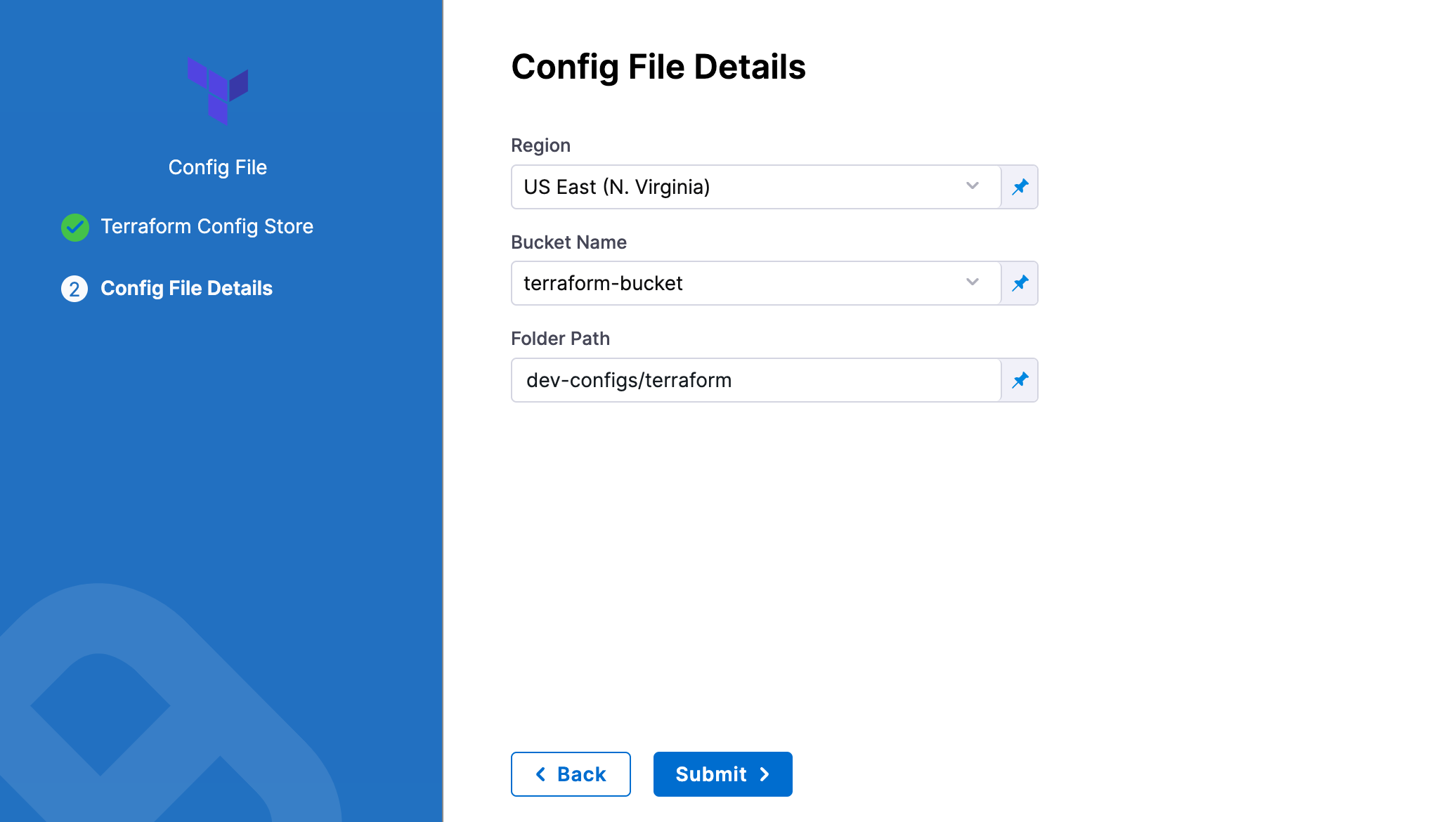2. In Bucket, select the bucket where your Terraform files are stored (all buckets from the selected region that are available to the connector will be fetched).