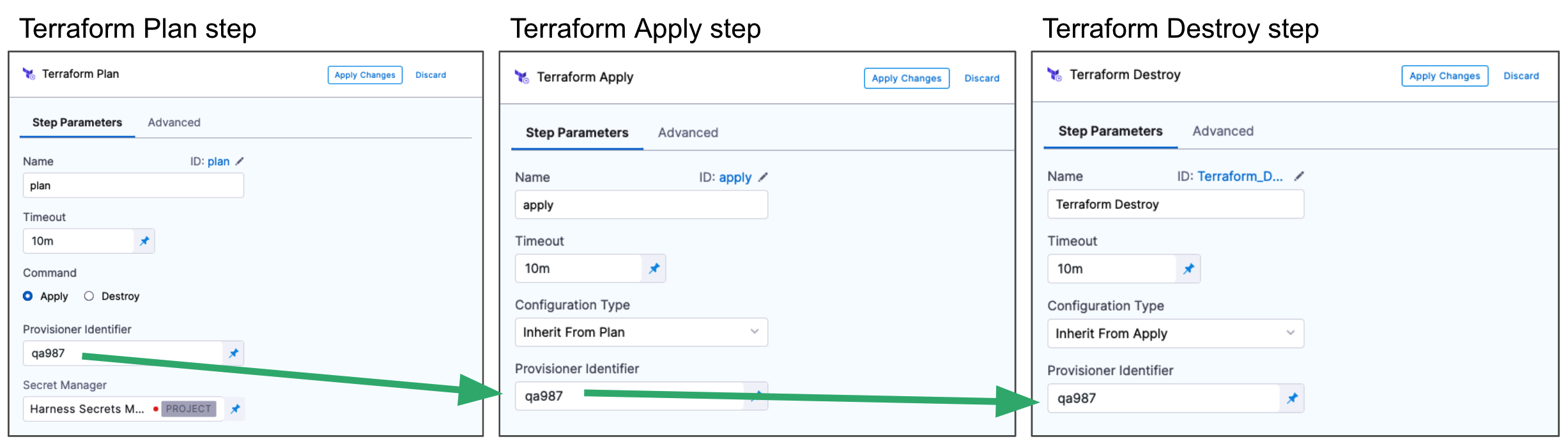 The most common use of Provisioner Identifier is between the Terraform Plan and Terraform Apply steps. For the Terraform Apply step, to apply the provisioning from the Terraform Plan step, you use the same Provisioner Identifier.