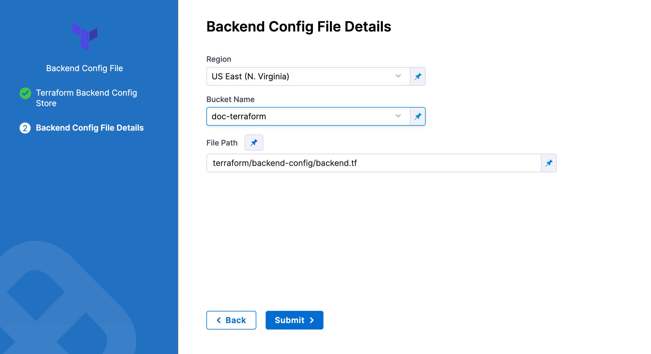 In Backend Configuration, you provide the required configuration variables for the backend type.