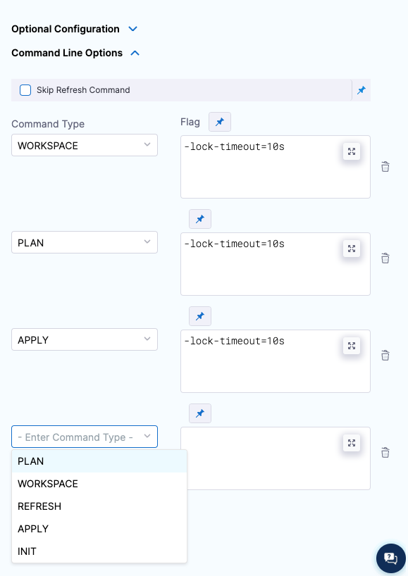 This setting allows you to set the Terraform CLI options for Terraform commands depending on the Terraform step type. For example: -lock=false, -lock-timeout=0s.