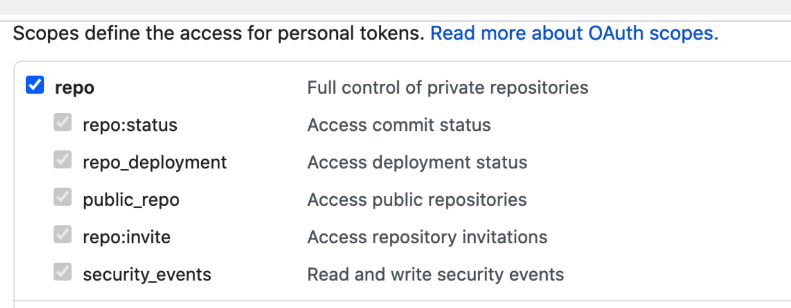 - Ensure you PAT has the repo scope selected: