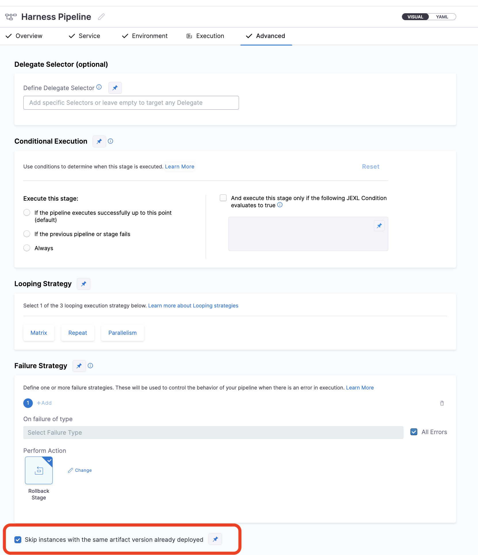 details, Harness will rollback the deployment to last successful pipeline with stage execution that shared the sameservice
