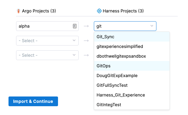 5. Map the Argo CD project to a Harness project and select Import & Continue. Do not re-map an existing mapping. Harness will throw an error.