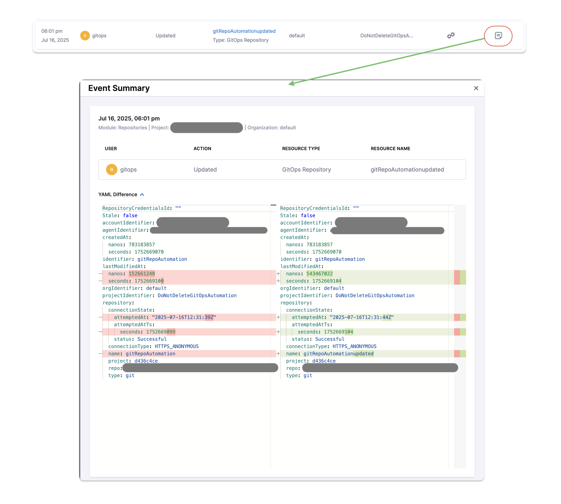 For each GitOps audit event, you can view the YAML difference to understand what changed.