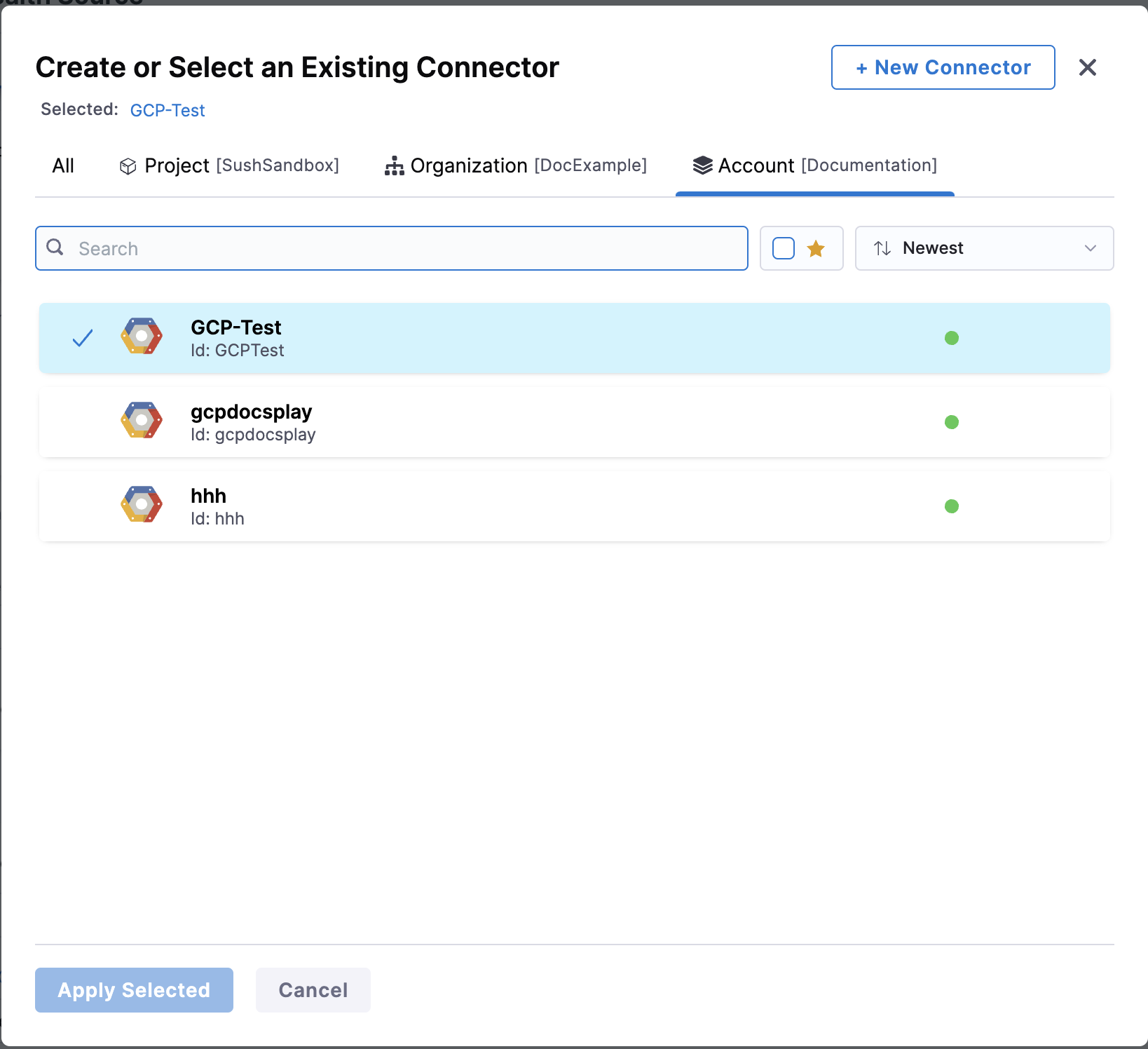 4. In Connector settings, you can either choose an existing connector GCP connector or click New Connector.