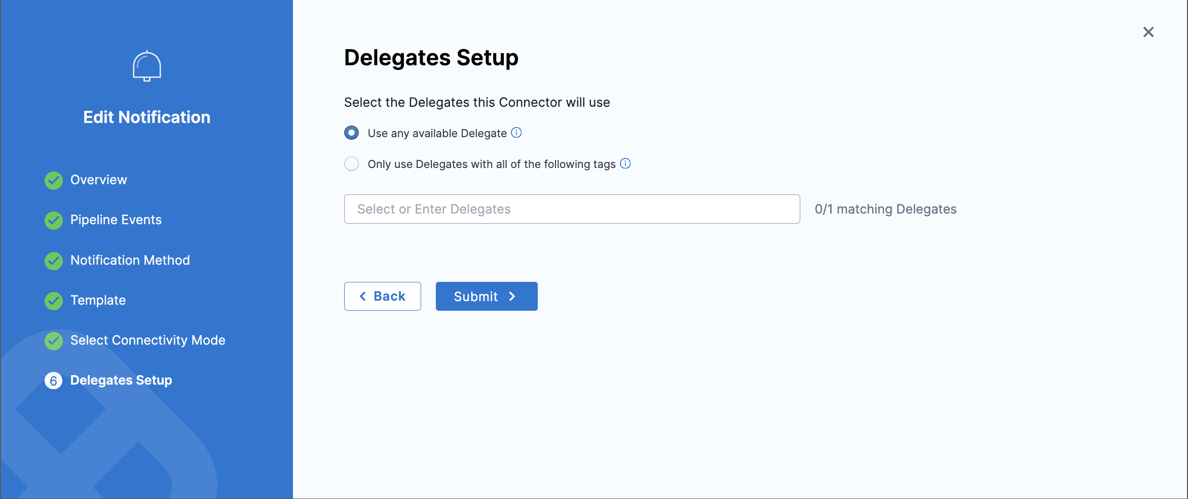 When you select Connect through Harness Delegate, and click on Continue, you will be asked to select the Delegate that this pipeline notification rule will use, in Delegate Setup.