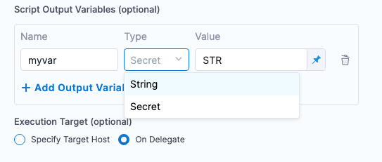 - Target Host: enter the IP address or hostname of the remote host where you want to execute the script. The target host must be in the Infrastructure Definition selected when you created the workflow, and the Harness Delegate must have network access to the target host. You can also enter the variable