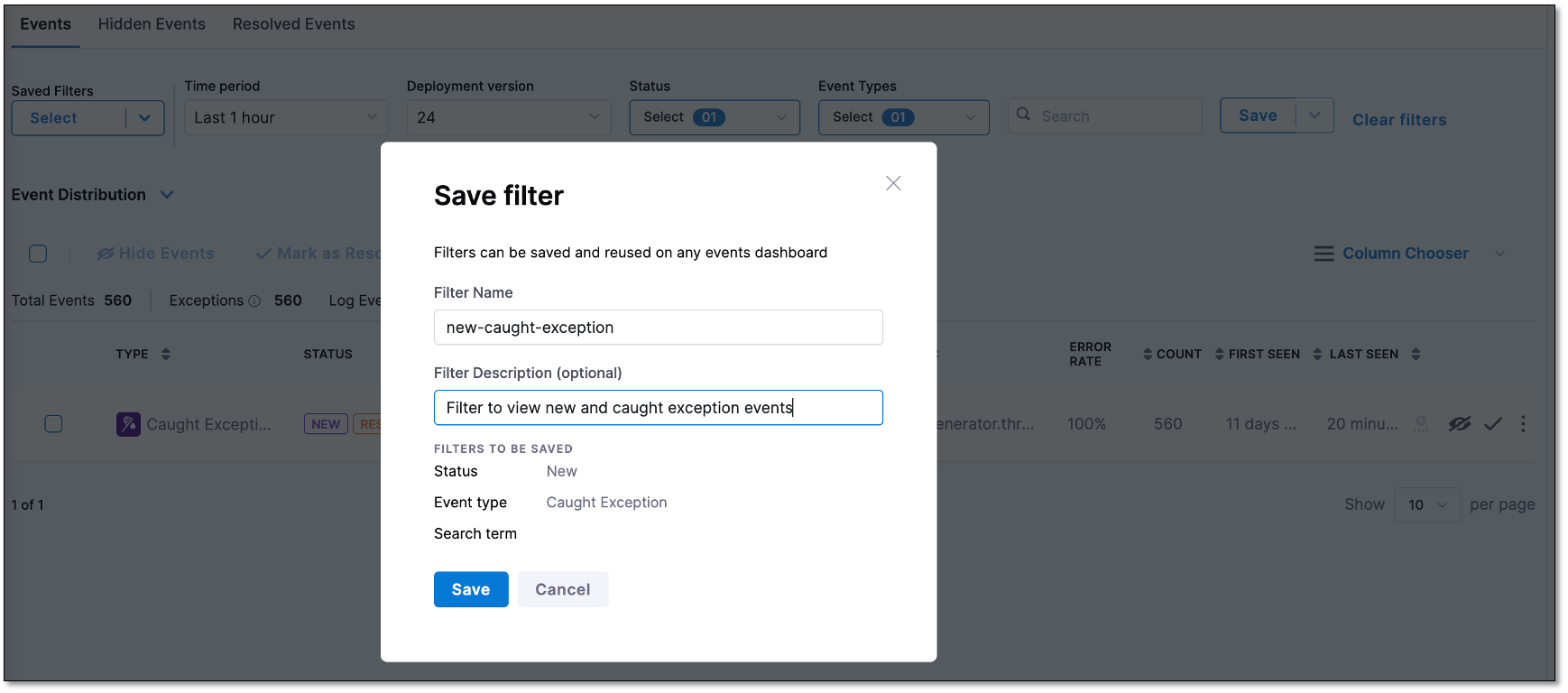 On the Events Summary page > Events tab, after configuring the desired filter settings, select Save.