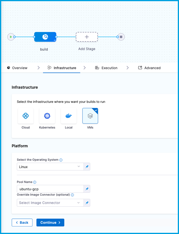 - In Harness, go to the CI pipeline that you want to use the AWS VM build infrastructure.