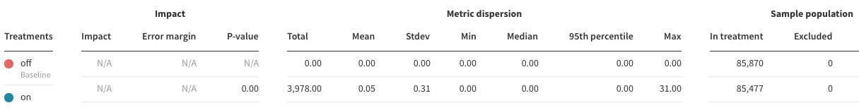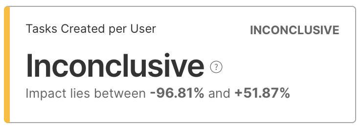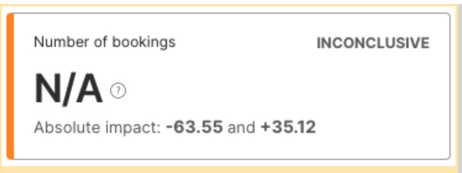 When the baseline treatment has a metric value of 0, the relative impact can’t be calculated and displays Inconclusive with a value of N/A on the card. Instead, the confidence interval is provided based on the absolute impact between the two treatments. The same information is provided as the statistically significant and statistically inconclusive cards but in absolute rather than relative terms.