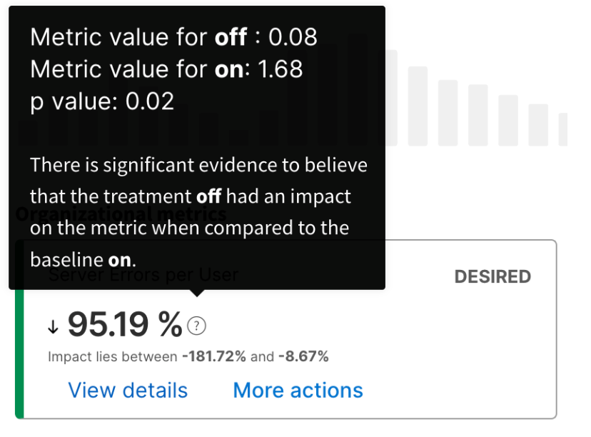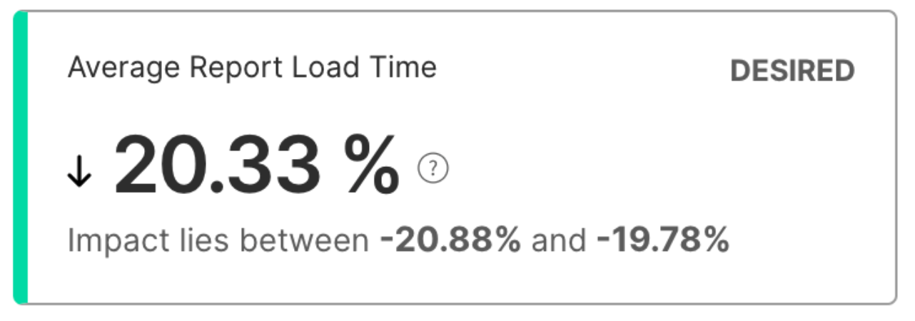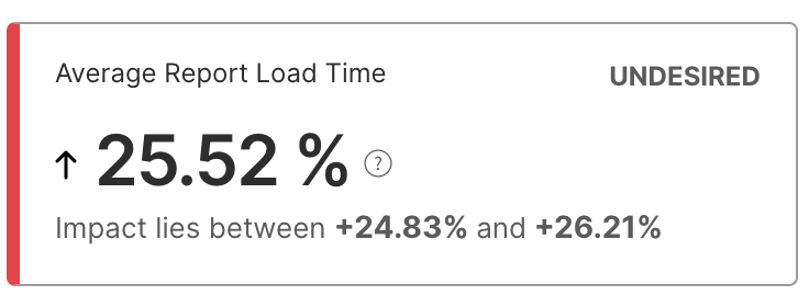 On a Desired, Undesired, or Inconclusive impact metric card, you can see the range that the impact lies between. The two values are the statistically calculated extreme values for your impact. The smaller the range between the extreme values, the higher the confidence in the predictability of the feature impact on the metric.