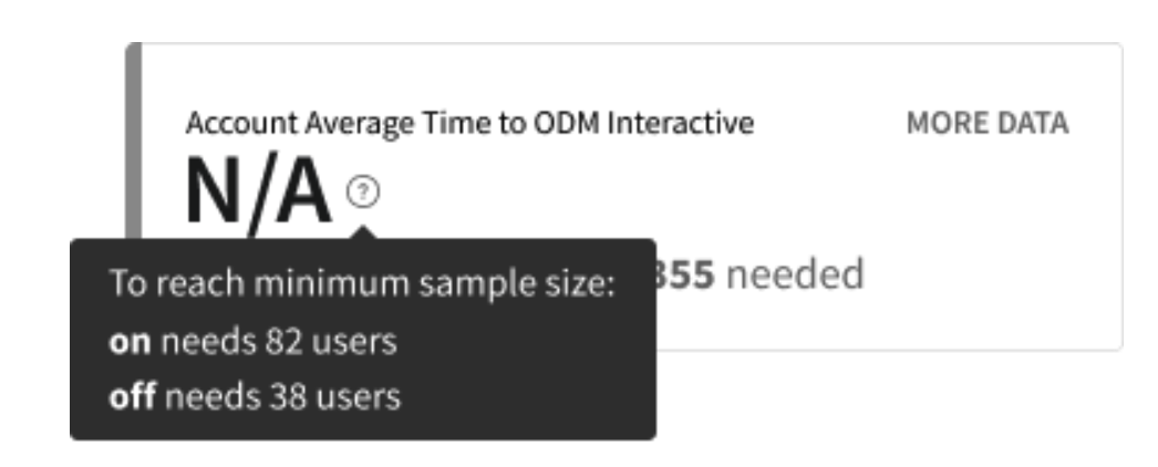 A metric card displays Needs more data when the treatments being compared have not reached the minimum sample size. (The minimum sample size is set in Experiment settings). We require data from a specific number of unique users in each treatment before we calculate significance for your metrics. For more information, refer to the Statistical significance.
