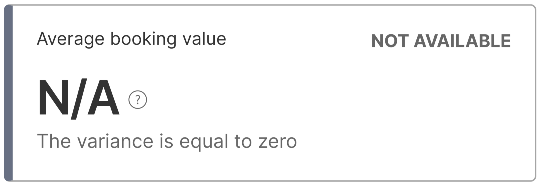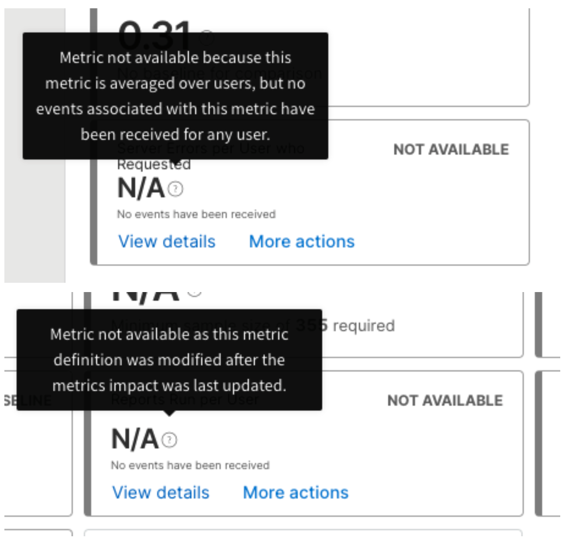When you hover over the question mark icon of a metric card showing 'Not available', the message that appears provides the reason why the metric value is not available.