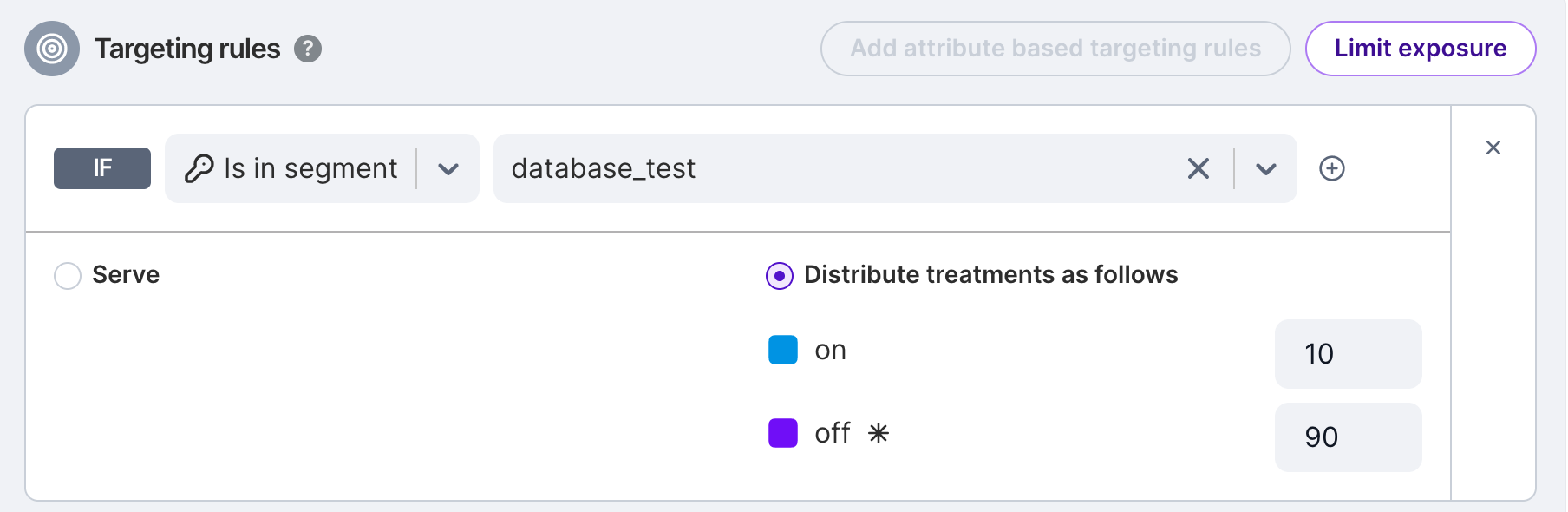 Then, in your test feature flag, you could have a rule that feature flags the traffic using percentages, but only for the 10% of the users that qualify. This has the same effect as limit exposure, but the percentage of users participating in the test is controlled by the parent feature flag.