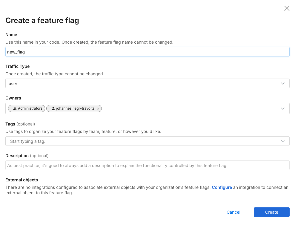 When you create a feature flag, you specify metadata, including the flag name, description, owners, and tags. This information helps you and your team manage your feature flags and customize them to your team's workflow.