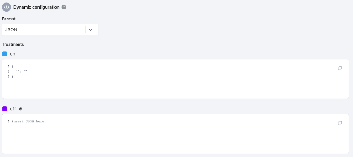 In the Format field of the Dynamic configuration area, select JSON as your format. You get a JSON editor for each of your treatments.