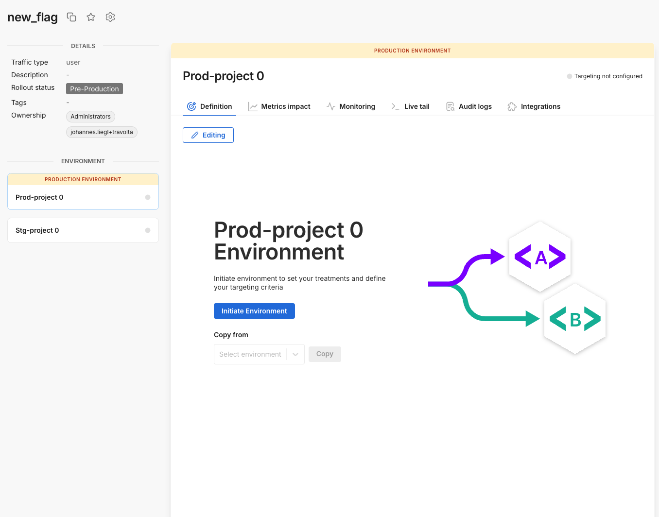 Initiating your feature flag definition for a given environment will create an initial set of treatments and a targeting rule that you can modify.