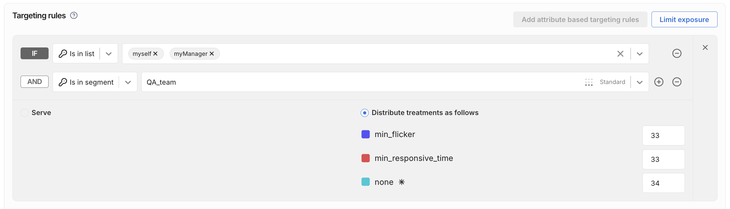 Click Add attribute based targeting rules to assign individual users or segments to a selected treatment or percentage distribution.