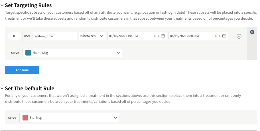 at a specific time, for a subset of users or for all users. - You can also configure it for a time window. For example, if you want to turn a message on alerting users during a maintenance window, you can set up the rule as shown in the following screenshot: