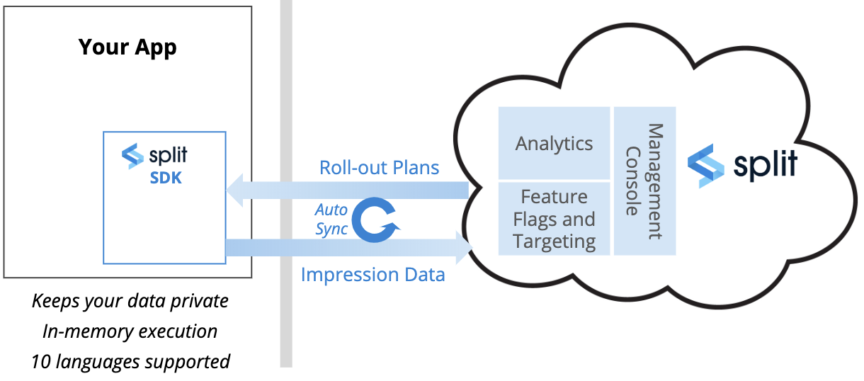 Before we dive into the product, let’s spend a moment looking at the architecture and data flow. The management console is where the user interacts with the Split platform. There’s also an API that allows you to automate many of the actions a user might take.