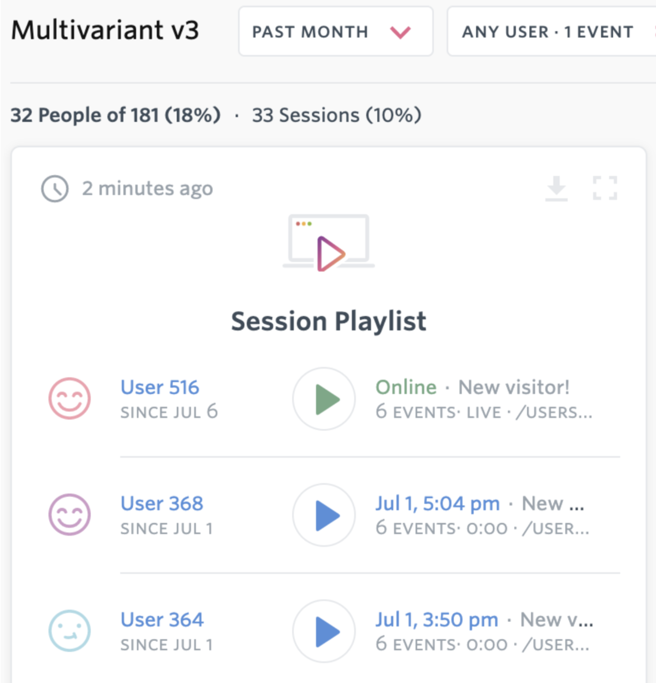 You can now play back and review specific customer experiences. Every session in this playlist showed v3 of the multivariant_demo feature flag.