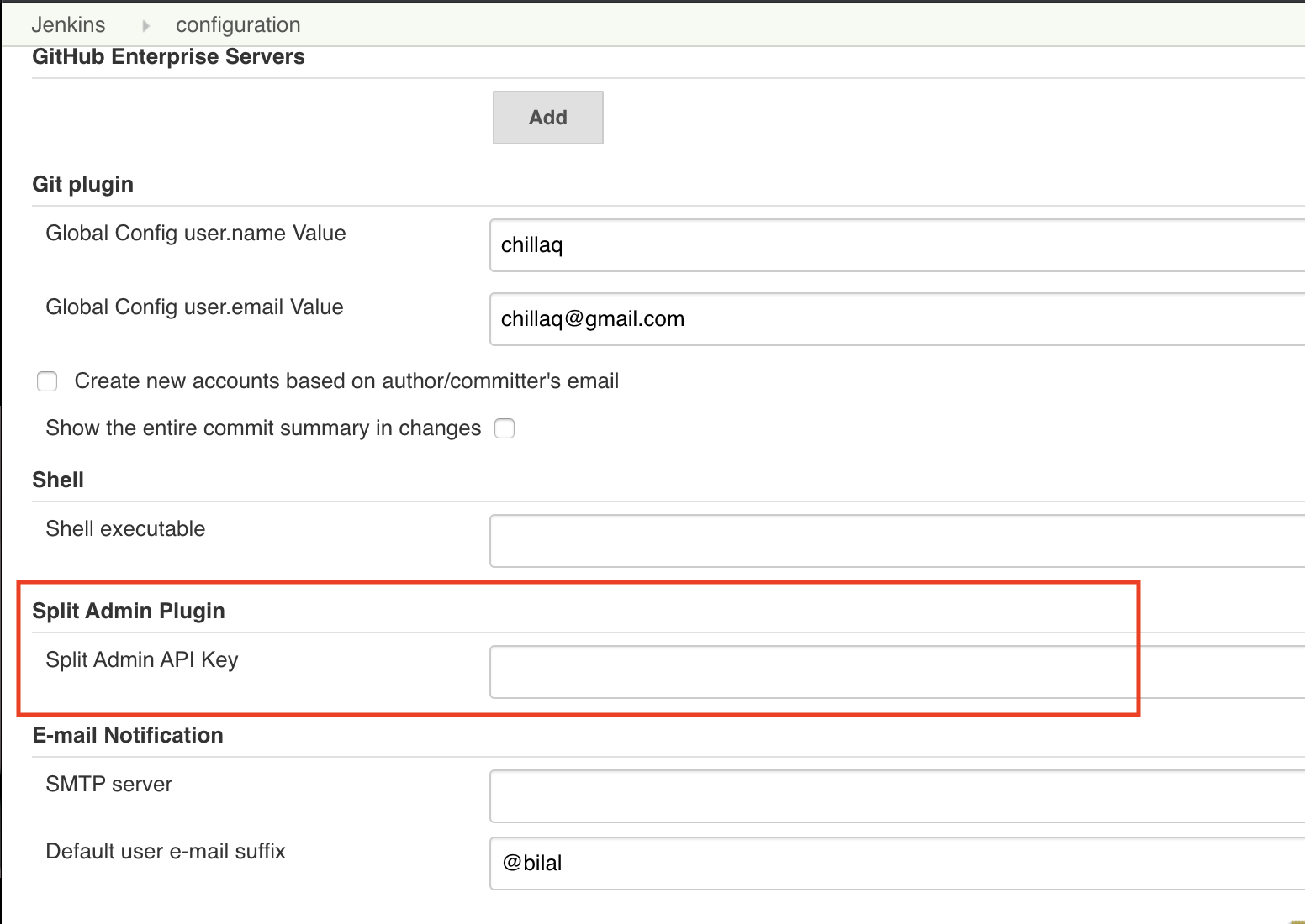Store the Harness FME Admin API Key in Split Admin API Key edit box found in Manage Jenkins-> Configure System page.
