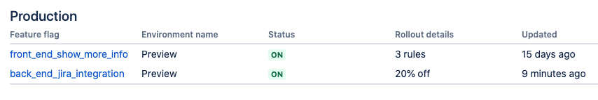 In Jira: You see either the name of the flag or the number of flags to which that issue is connected. On the right hand side, it indicates if the feature flags are active in the primary environment, which is selected for each project when the integration is set up.