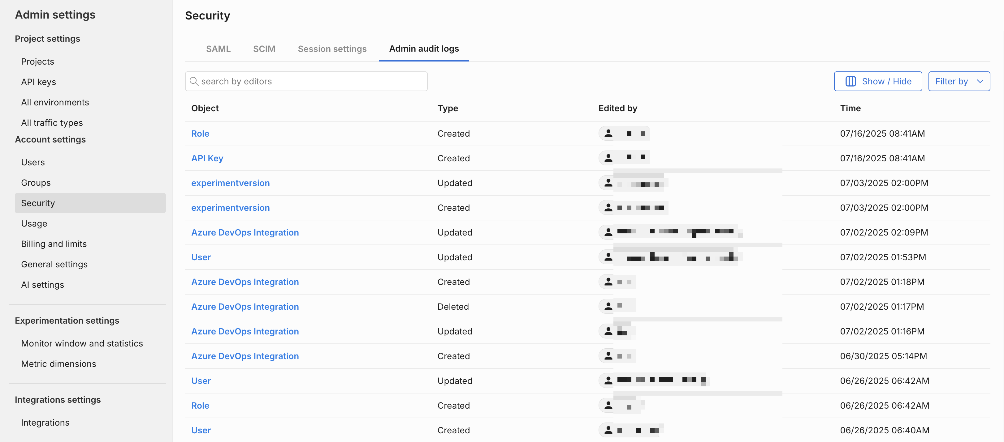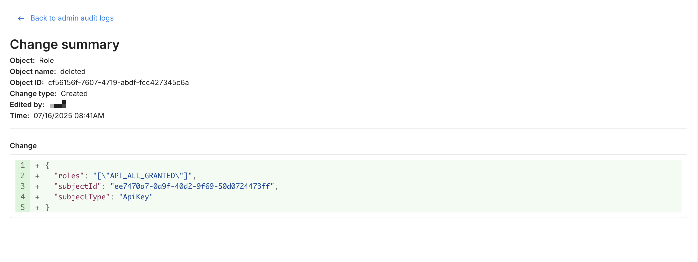Admin audit logs are captured every time an admin makes a creates, changes, or deletes any of the below objects. These logs provide detailed records of every change that took place and who made them.