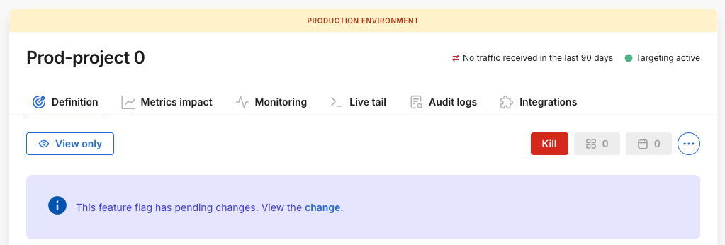 If the environment is set to Allow Admins to Skip the Approval, the following message appears on the feature flag that indicates that the admin now has the option to skip approvals. This message is only available for Admins. For other users, the message Approvals required appears.