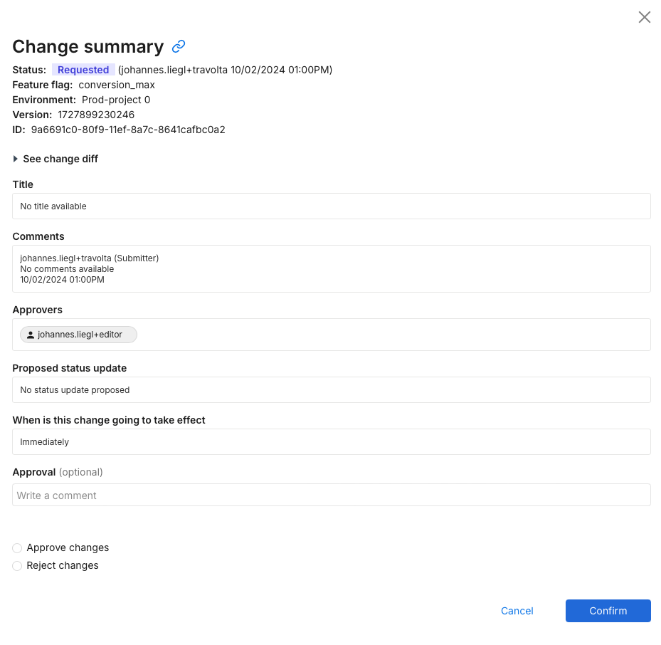 Additionally, you can also change permissions when you click the Review changes button on the Targeting rules page. This takes you to the Change summary page with the option to either click the Skip Approvals & Save link or go through the approval process similar to other users.