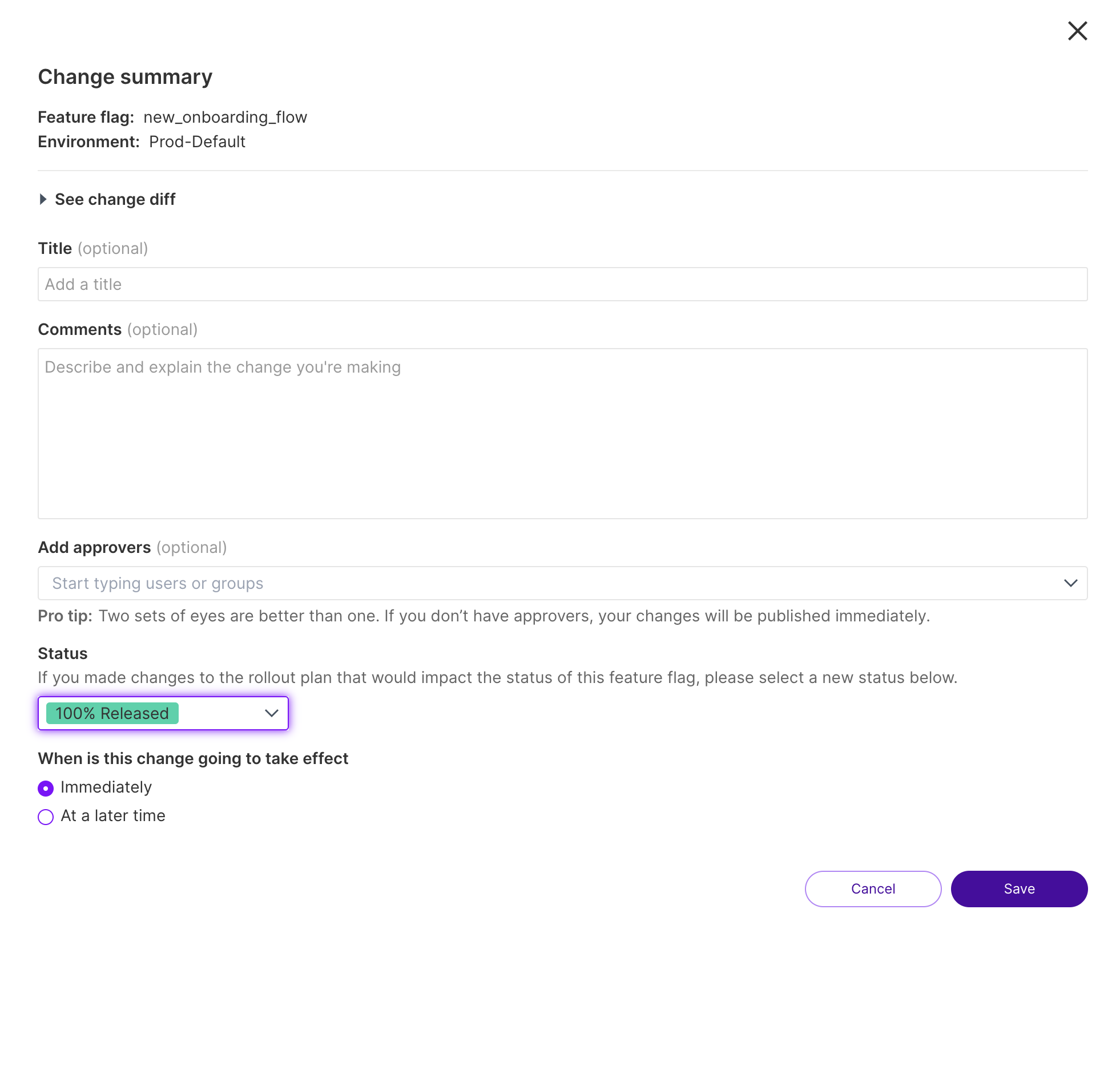 After submitting a change to the rollout plan of a feature flag, on the Change summary page, in the Status field, select the desired status, e.g., Internal testing.