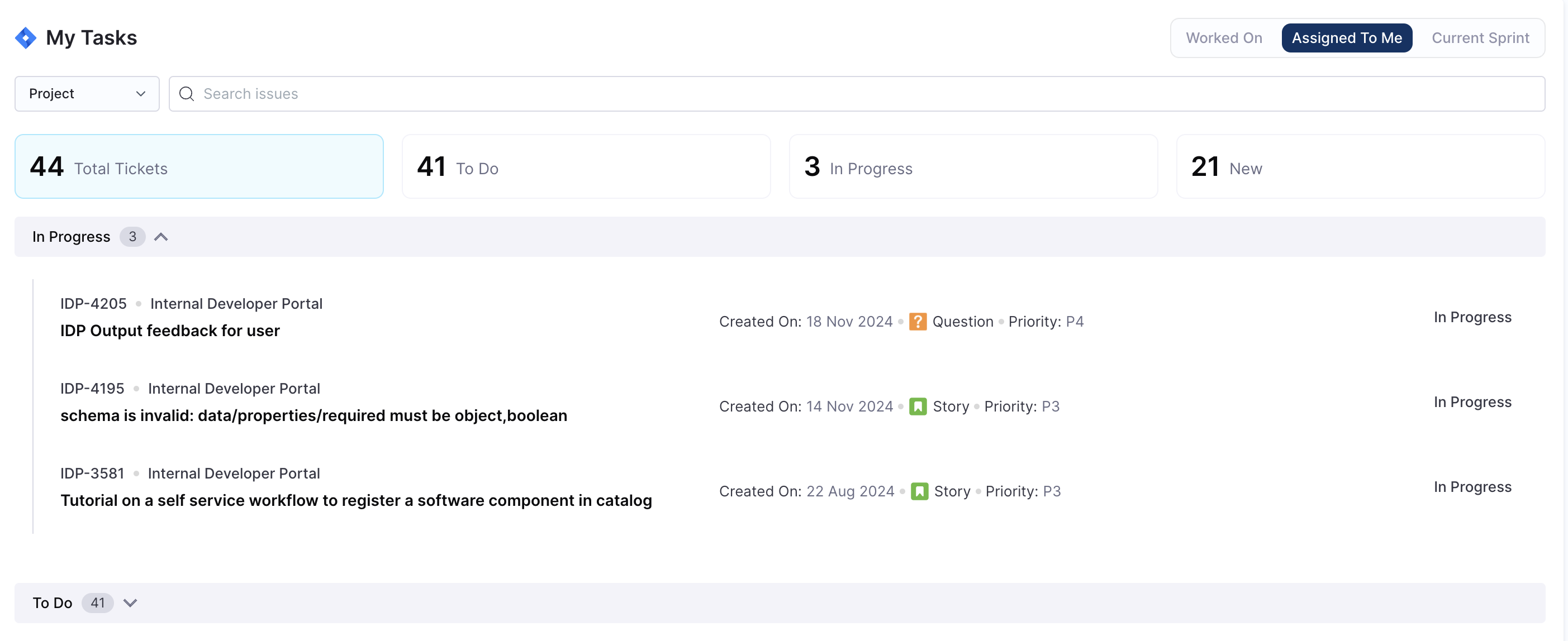 This JIRA card offers a centralized view of your assigned tasks, ensuring easy tracking of work items. It provides a categorized summary of the tickets you're currently working on, tickets assigned for the sprint, including their current status, priority, and associated metadata.