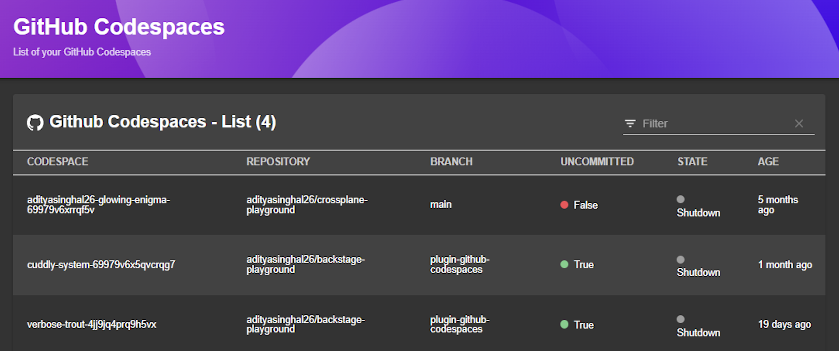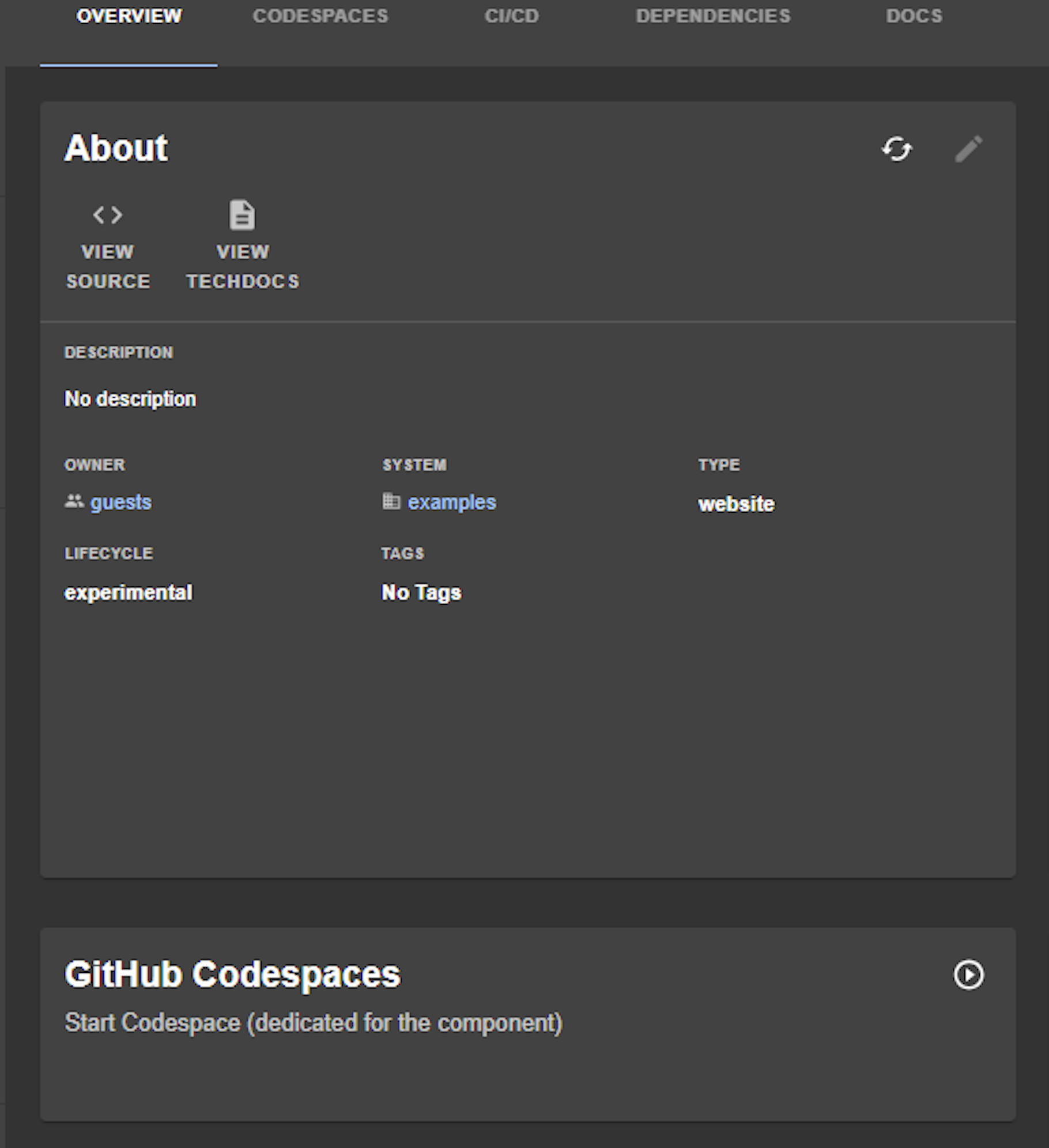 This plugin exports a page and two cards on the overview page, one to start a Codespace and another with a list of already active Codespace. Go to Admin > Layout, select Service in the dropdown menu, and then you could find the following YAML code auto-ingested: