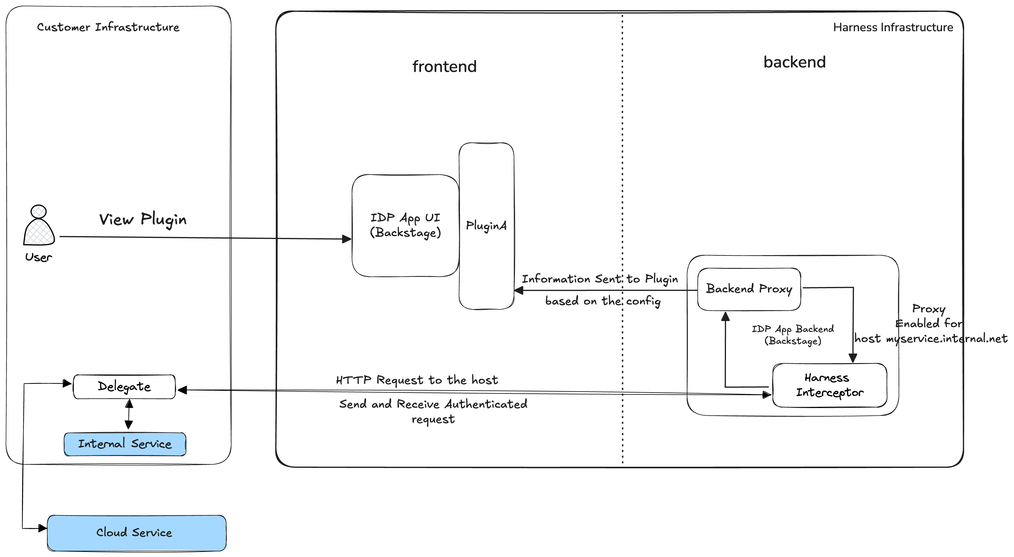 Delegate Proxy (Delegate HTTP Proxy) | Delegate Proxy in IDP is an HTTP interceptor in the backend which helps plugins connect to systems which are not accessible from the Harness SaaS platform. They use a Harness Delegate which is a service you run in your local network or VPC to connect your artifacts, infrastructure, collaboration, verification, and other providers with Harness. |