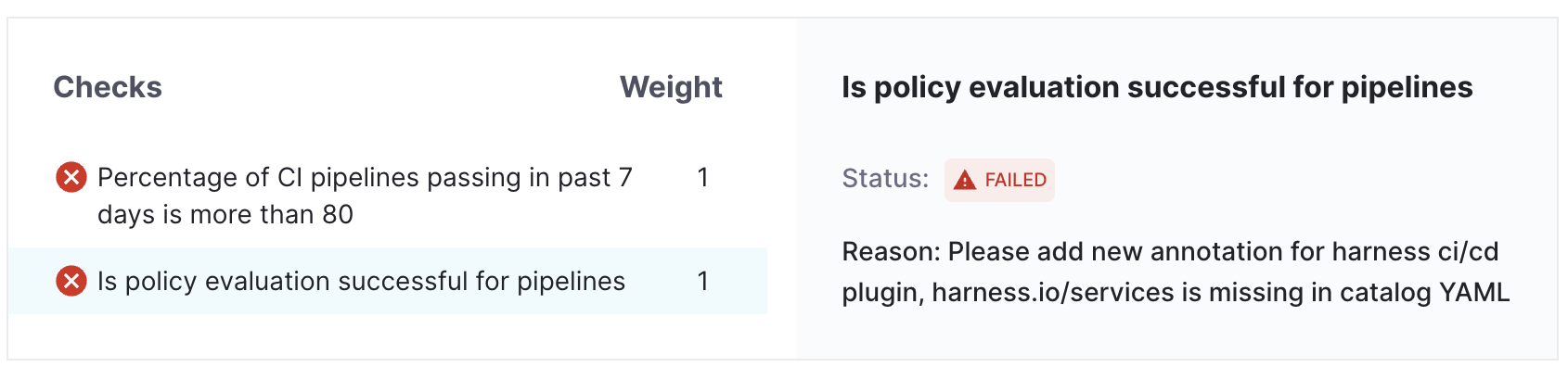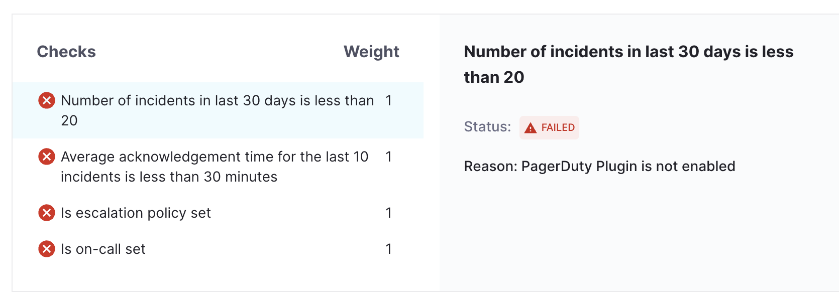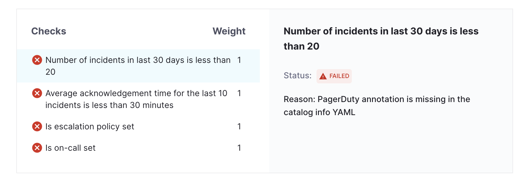 • Calculation Method: The catalog YAML is inspected to check if the pagerduty.com/service-id is present under the metadata field.