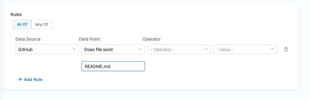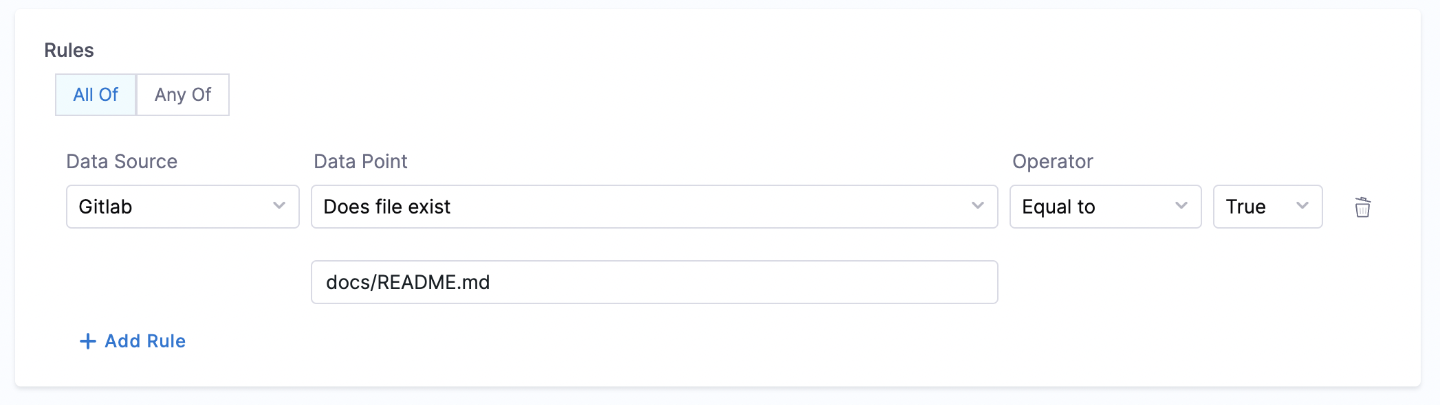 • Calculation Method: Use the backstage.io/source-location annotation to locate the repository and check for the file’s presence. Make sure to mention the filename with extension or relative path from the root folder (e.g.: README.md or docs/README.md) in the conditional input field.