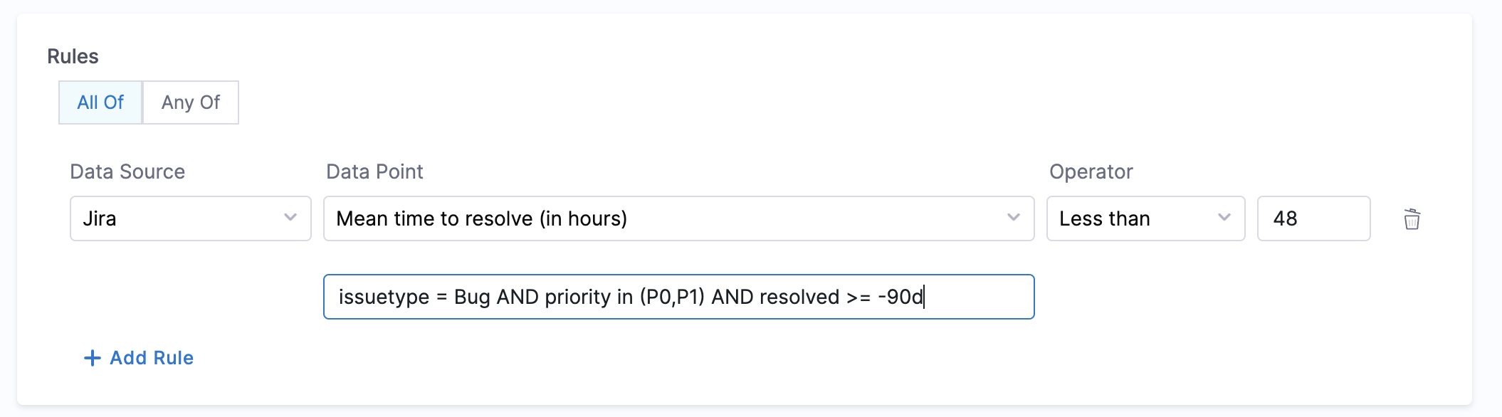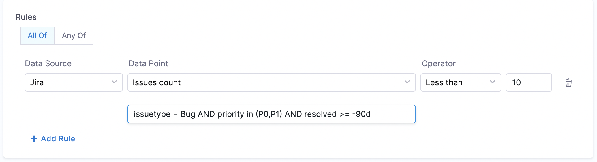 1. Mean time to resolve bugs: issuetype = Bug AND priority in (P0,P1) AND resolved >= -90d