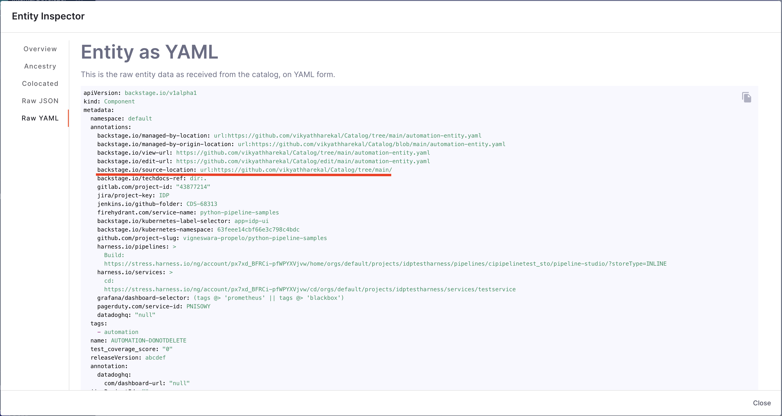• Prerequisites: Provide suitable backstage.io/source-location annotation if the catalog YAML file is present outside the source GitHub repository.