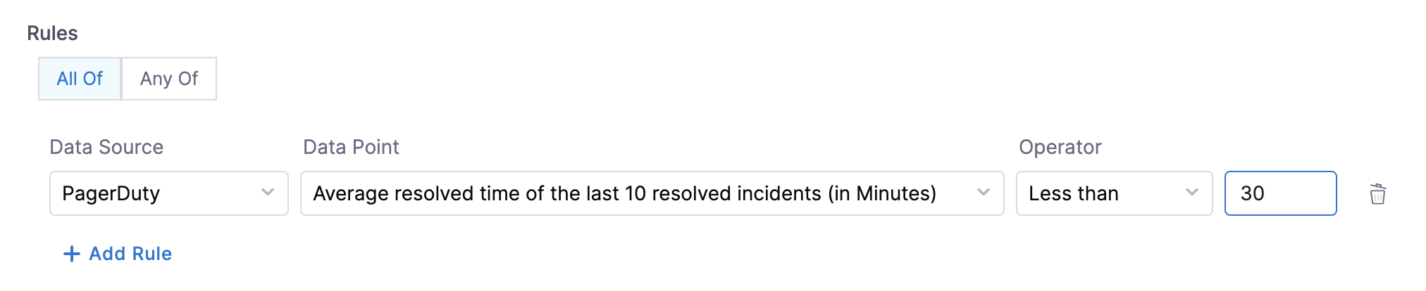 1. Average resolved time of the last 10 resolved incidents (in Minutes) - This data point can be used to create rules to check if the average resolved time for the last 10 resolved incidents (in Minutes) is less than the given provided input values.
