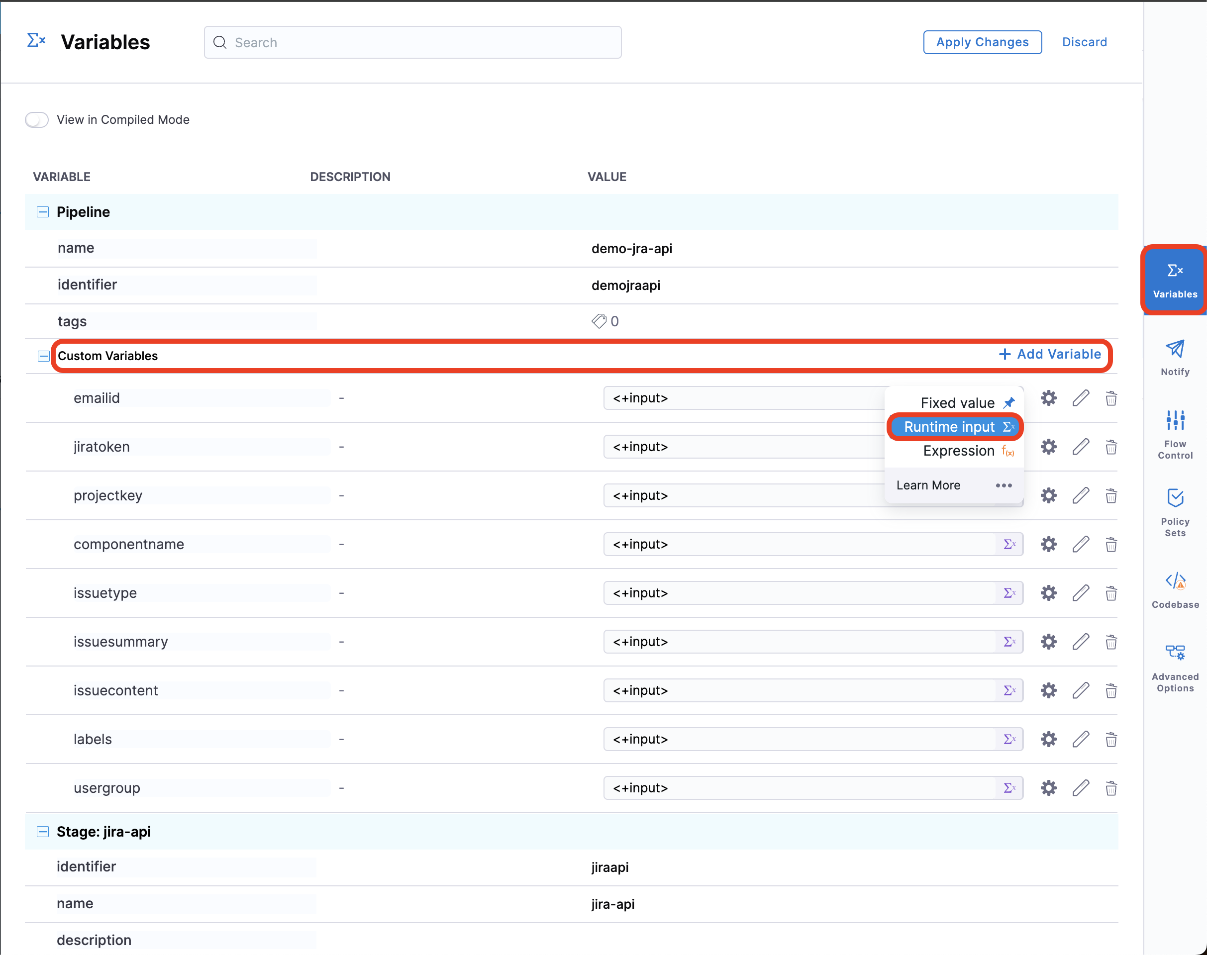 Go to Variables on the right side of the page and add the following variables and have the input type as Runtime Input.