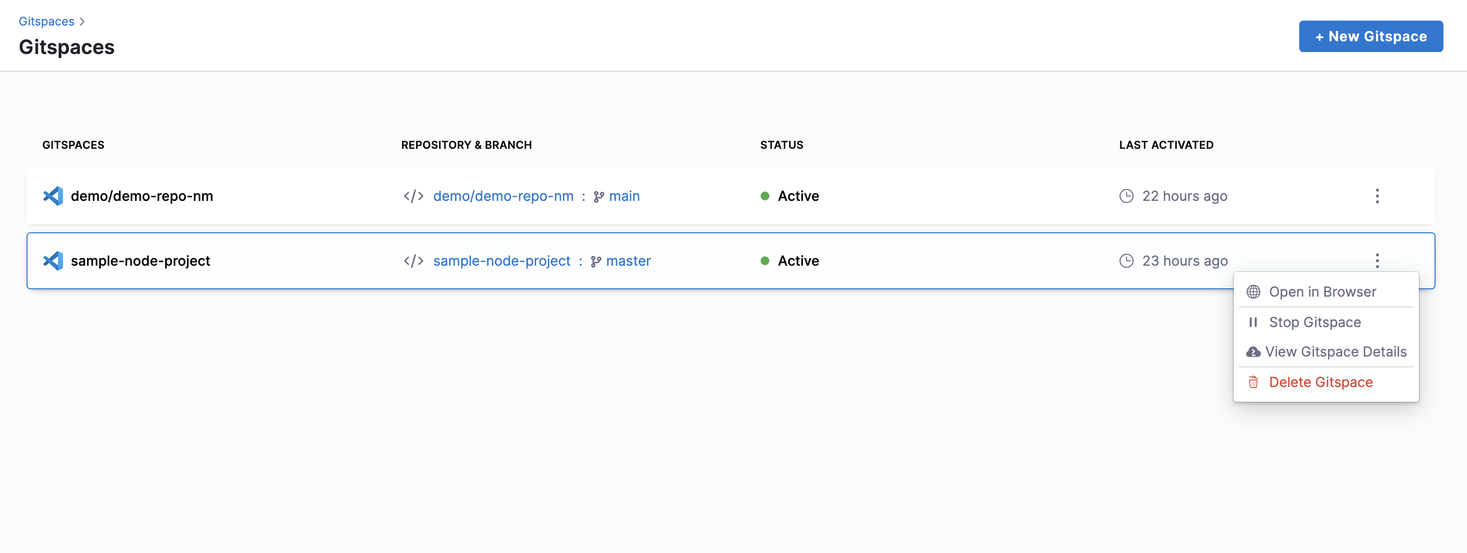 1. Click on a stopped Gitspace and you’ll see the Start Gitspace button in the popup.