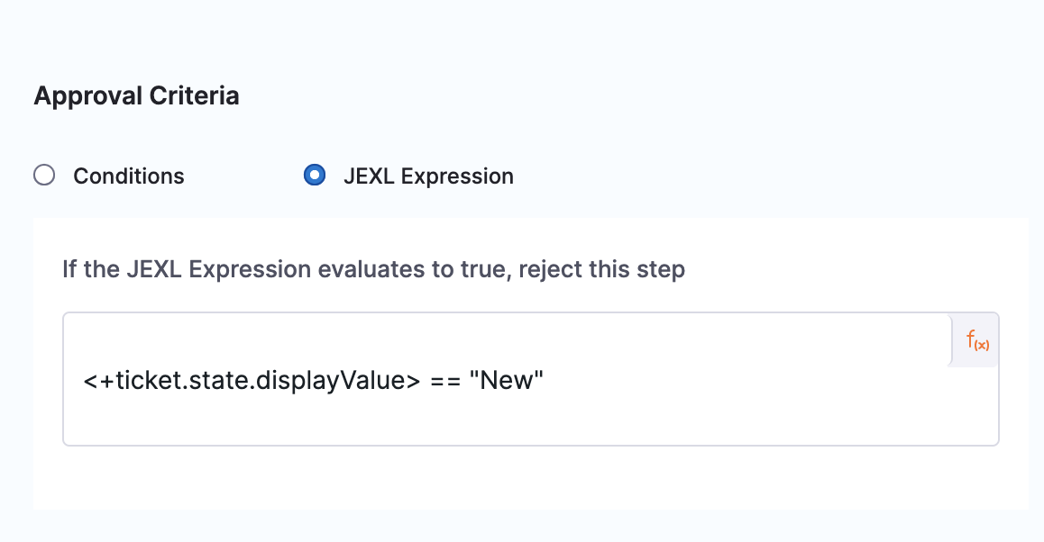 in the Approval Criteria, JEXL Expression checks to see if the status of the ticket is New.